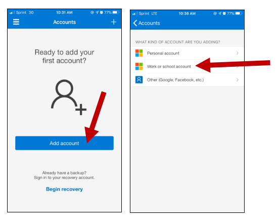 4) Open the Microsoft Authenticator app. Choose Add Account and then select Work or School.